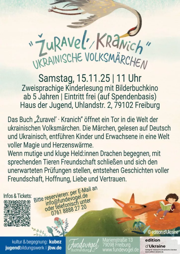 Erlebt Geschichten aus dem Buch „Kranich. Ukrainische Volksmärchen“. Ein besonderes Erlebnis für Kinder ab 5 Jahren, Familien und alle Literaturinteressierten.