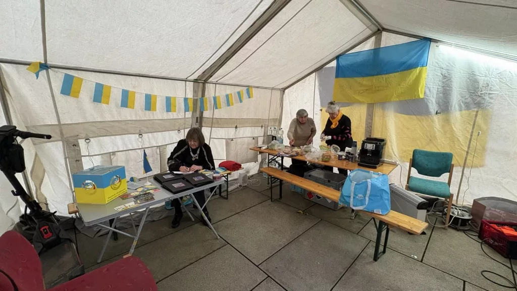 Auf dem Platz der Alten Synagoge stand ein Zelt mit dem Titel „Punkt der Unbeugsamkeit“. Es sollte anschaulich zeigen, wie sich Menschen in Teilen der Ukraine angesichts zerstörter Infrastruktur selbst helfen. „Dort soll nachgestellt werden, wie die aktuellen Lebensumstände in Teilen der Ukraine sind“, erklärt Vhyovska. In solchen Zelten können sich Menschen aufwärmen, heiße Getränke bekommen, essen und ihre Handys oder Powerbanks laden.