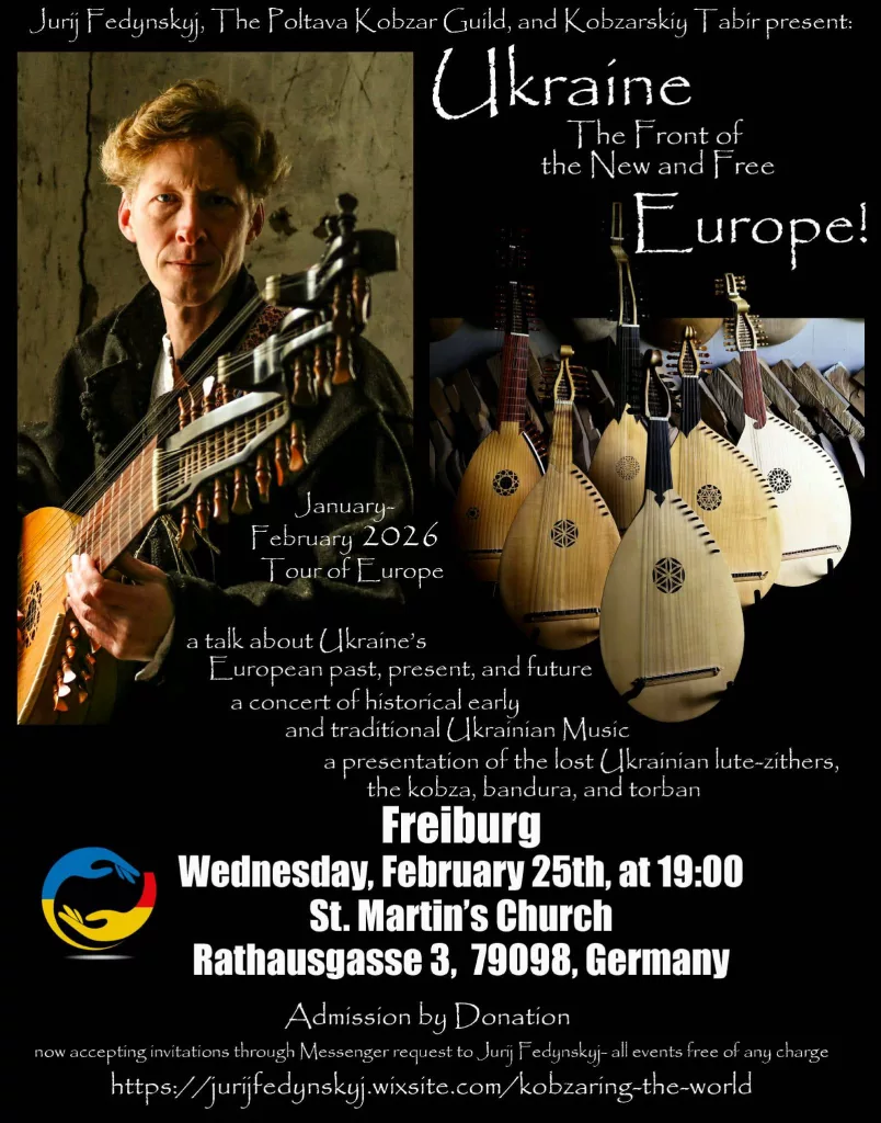 Jurij Fedynskij ist Musiker, Sänger, Forscher und Meister traditioneller Musikinstrumente. Als einer der bedeutendsten modernen Bewahrer der Kobzar-Tradition widmet er sich seit vielen Jahren dem Studium authentischer ukrainischer Musik, insbesondere alter Epen, geistlicher Lieder und Volksballaden.
