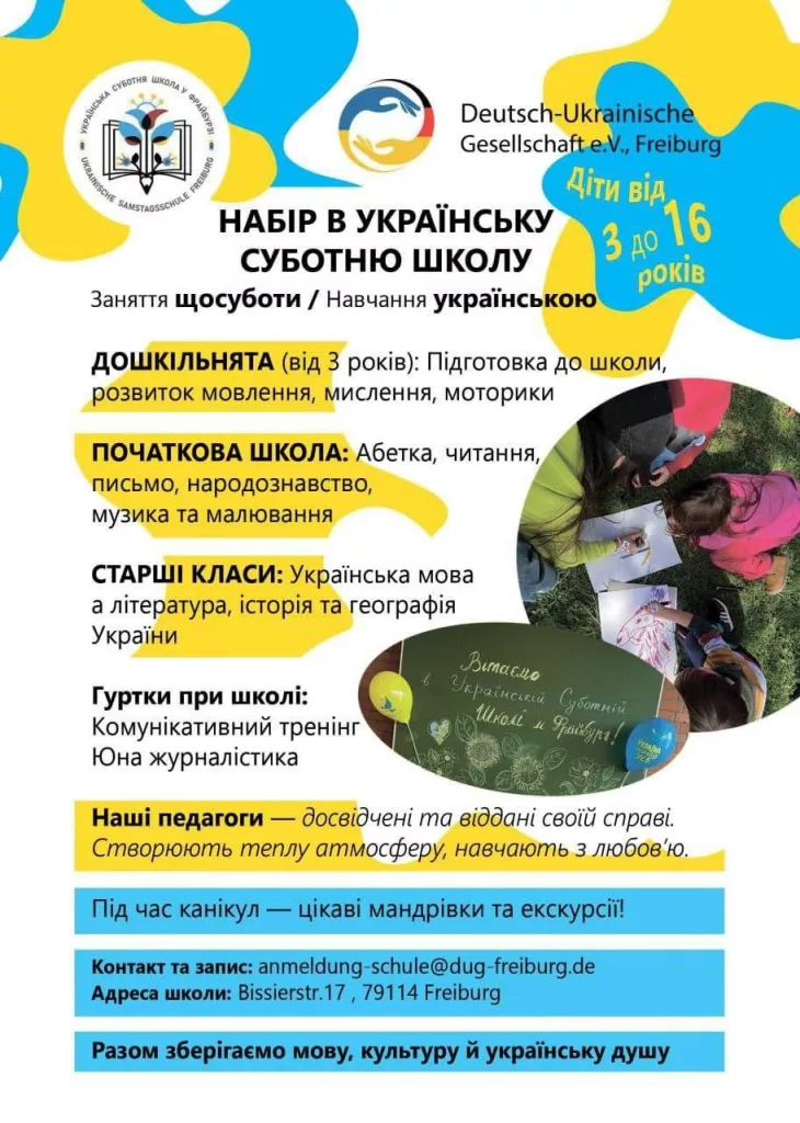 Die Ukrainische Samstagsschule Freiburg freut sich, die Einschreibung von Schülern für die erste Klasse im Schuljahr 2023-2024 bekannt zu geben.